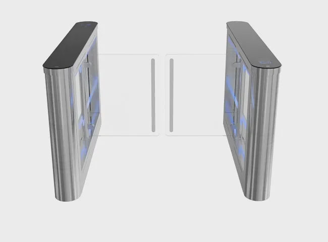 The swinging waist-high turnstile Sweeper-W, with increased flow capacity, can operate in two modes: normally closed and normally open. Both directions of passage are free when the turnstile is de-energized.